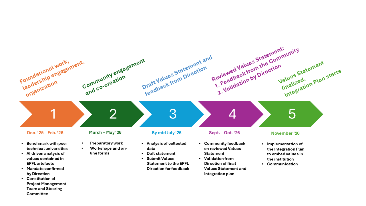 The reviewed Values Statement will be shared with the community and representative bodies for consultation. After refinement, the final version and an Integration Plan will be submitted to the EPFL Direction for approval.